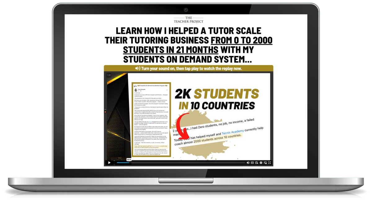 From 0 to 2000 students in 21 months. Witness, learn, replicate. Get the roadmap with your book. Watch me interview one of my clients who implemented this method and achieved outstanding results.